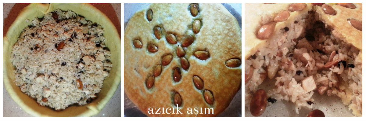 Pilavın üzerini örten yufka:Haneyi,evi,yuvayı temsil eder.İçindeki tavuk eti ki eskiden horoz etiyle yapılırmış erkeği eşi,bademler:erkek çocuğu,fıstıklar ise kız çocuğu temsil edermiş.İçinde kullanılan baharatlar ise:Acı tatlı günleri.Bu durumda kayın validenin mesajı gayet net anlaşılıyor sanırım.Evlatların ve eşin ile geçireceğin acı,tatlı günlerin olacaktır.Sen bunları perdele,sakla ki,huzurun,mutluluğun daim olsun,hanen yuvan dağılmasın...Kinayeli bir o kadar zarif ama leziz bir mesaj...